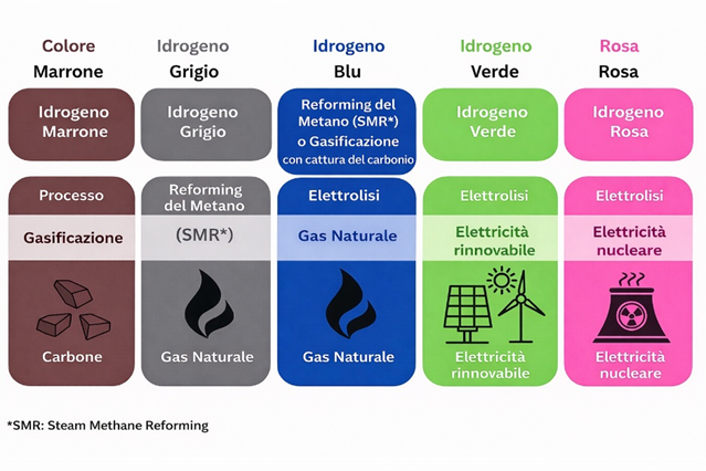 L’idrogeno può essere prodotto da tre fonti: combustibili fossili, acqua e biomasse. A seconda del metodo con cui è stato prodotto e dell’impatto ambientale che ne deriva, l’idrogeno si distingue in diverse categorie, associate convenzionalmente a dei colori. [1]